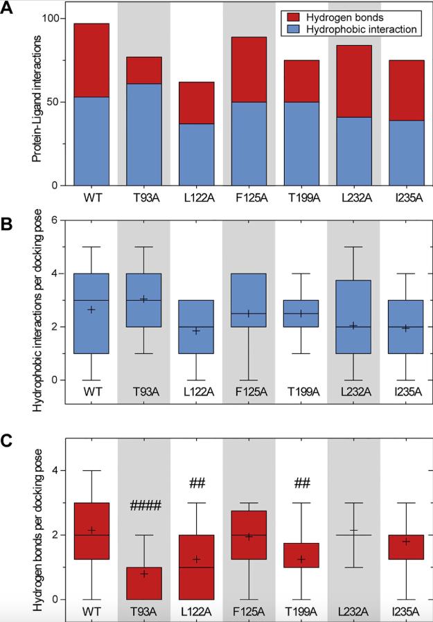 Figure 7. Comparison of the amount of protein–ligand interactions for the docking poses of WT and mutant channels. (A) Total amount and character of protein–ligand interactions of all 20 docking poses for the respective channel variant. (B, C) Boxplots indicating the amount of hydrophobic interactions (B) and hydrogen bonds (C) per docking pose. Boxes indicate the first and third quartile, whiskers indicate the minimum and maximum, bands inside the boxes indicate the median, and + indicates the mean. ##p < 0.01, ####p < 0.0001vs. WT. Note that variant L122A that has been identified as being most relevant for ranolazine binding in the experimental data, also forms the fewest interactions in the in silico simulations. More detailed information on the interaction profiles of ranolazine and the individual mutant variants can be found in Supplementary Figure S3 . |