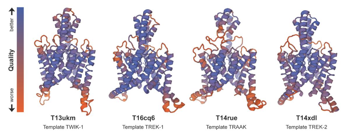 Figure S1. Illustrations of the four generated TASK-1 homology models. The local QMEAN (an estimate of the local model quality calculated by SWISS-MODEL) is color coded with blue reflecting a good local model quality and orange reflecting a bad local quality. |