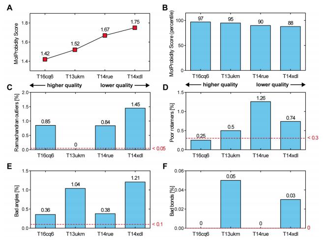 Figure S2 MolProbidity Assessment of TASK-1 homology models T16cq6 (TASK-1 model based on the crystal structure of TREK-1; Protein Data Bank (PDB) ID: 6CQ6), T13umk (based on TWIK-1; PDB ID: 3UMK), T14rue (based on TRAAK; PDB ID: 4RUE), and T14xdl (based on TREK-2; PDB ID: 4XDL). (A, B) The MolProbidity Score is given as a numerical value (A) and as the respective percentile (B). The score summarizes different aspects of all-atom contacts and protein geometry that are being assessed during the MolProbidity analysis. Some of these aspects are reported in (C â F) (Davis et al. 2007). A model with a lower MolProbidity score is considered a more accurate model. (C) The percentage of outliers in the Ramachandran analysis (Ramachandran et al. 1963) is given for the different models. A value of < 0.05 is considered favorable. (D) Proportion of poor rotamers within the respective model. A value of < 0.3 is preferable. (E) Proportion of bad angles within the respective model. A value of < 0.1 is preferable. (F) Proportion of bad bonds within the respective model. A value of 0 is preferable. |