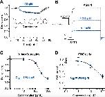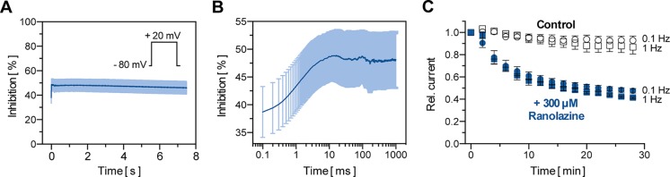 Figure 3. Biophysical properties of TASK-1 blockade by ranolazine. (A) The inhibition of TASK-1 current is displayed over a 7.5 s test pulse from −80 mV to +20 mV (n = 6). (B) Representation of the first 1000 ms of (A) on a logarithmic time scale (n = 6). (C) Frequency dependency of TASK-1 blockade by ranolazine; current amplitudes obtained during 30 min stimulation from −80 mV to +20 mV at stimulation rates of 0.1 Hz and 1 Hz are displayed under control conditions and during administration of 300 µM Ranolazine (n = 5–6). Currents are normalized to their respective values after a stabilization period. Data are given as mean ± SEM. |