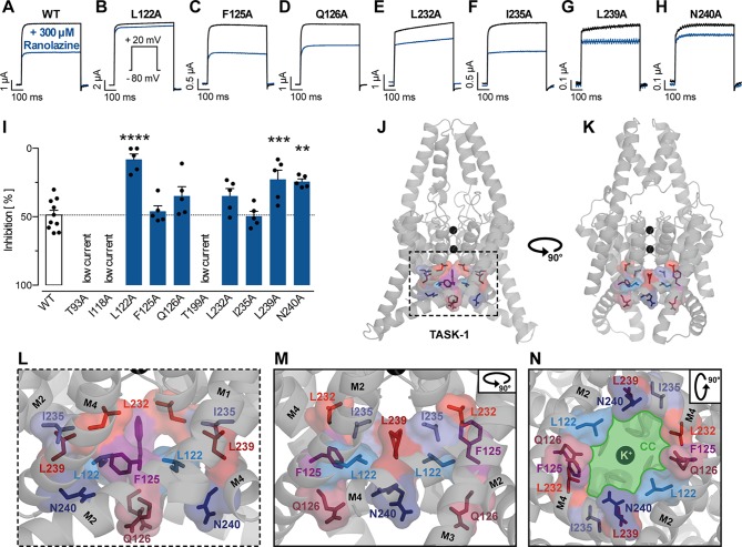 Figure 6. Effect of ranolazine on TASK-1 pore mutants. (AâH) Representative current recordings evoked by a test pulse from â80 mV to +20 mV under control conditions and after 30 min incubation with ranolazine. (I) Current inhibition by 300 µM ranolazine on the different TASK-1 pore mutants, **p < 0.01, ***p < 0.001, ****p < 0.0001, one-way ANOVA and post-hoc Bonferroniâs multiple comparisons test of WT vs. the respective mutant. (J, K) TASK-1 homology model based on TREK-1 illustrating the location of amino acid residues included in the mutagenesis screen. (L) Zoom into the inner pore region. (M) Lateral view as in panel (L) but from a different angle [as in panel (K)]. (N) View from inside the cell into the central cavity (CC) of the inner pore. Note how the displayed residues line the central cavity (illustrated in green) of the TASK-1 inner pore. |