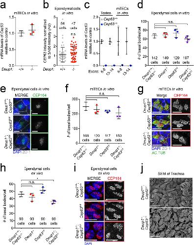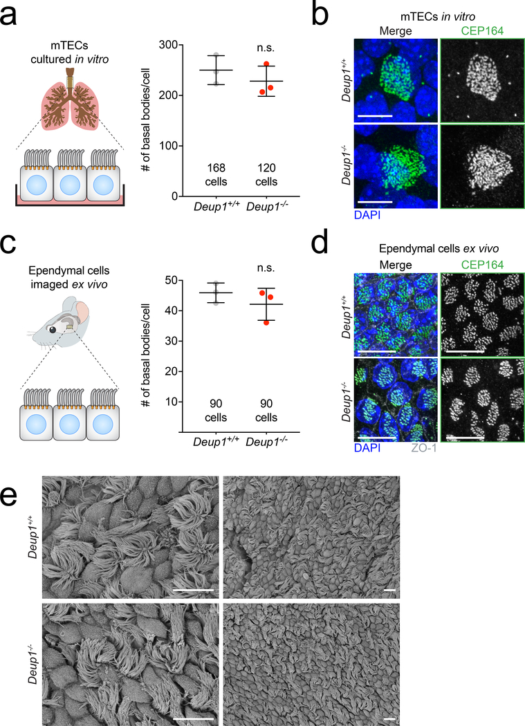 Fig. 2. Deuterosomes are dispensable for centriole amplification during multiciliogenesis(a) Quantification of basal body number in mTECs from Deup1+/+ and Deup1â/â mice. Basal bodies were stained with CEP164. n = 3 mice/genotype. The total number of cells analyzed per genotype is indicated. P values, unpaired, two-tailed, Welchâs t-test. n.s. = not statistically significant (p > 0.05). Bars represent mean +/â SD.(b) Representative images of basal bodies stained with CEP164 from Deup1+/+ and Deup1â/â mTECs. Scale bars represent 5 μm.(c) Quantification of the basal body marker CEP164 foci in ependymal cells from Deup1+/+ or Deup1â/â adult brain sections. n = 3 mice/genotype. The total number of cells per analyzed genotype is indicated. P values, unpaired, two-tailed, Welchâs t-test. n.s. = not statistically significant (p > 0.05). Bars represent mean +/â SD.(d) Representative images of ependymal cells in adult brain sections from Deup1+/+ or Deup1â/â mice. DAPI marks the nuclei, ZO-1 marks tight junctions and CEP164 stains basal bodies. Scales bar represent 10 μm.(e) Scanning electron microscopy images of tracheas from Deup1+/+ or Deup1â/â adult mice. Scale bar represents 10 μm. |