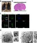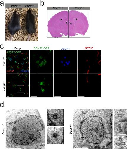 Fig. 1. Deup1 knockout mice lack deuterosomes.(a) Images of 5-month-old Deup1+/+ and Deup1â/â mice.(b) Histological sections from the brain of adult Deup1+/+ and Deup1â/â mice. Arrowheads mark the lateral and third ventricles. Note there is no apparent hydrocephalus in the Deup1â/â mice.(c) Immunofluorescence images of Centrin 2-GFP expressing Deup1+/+ and Deup1â/â ependymal cells in vivo. Brain sections were stained with antibodies against GT335 to mark cilia and DEUP1 to mark the deuterosome. Scale bars represent 2 μm.(d) Transmission electron microscopy of Deup1+/+ and Deup1â/â ependymal cells in the growth stage. In Deup1+/+ cells deuterosomes are clearly observed in the cytoplasm (Box 1 and 2). In Deup1â/â cells deuterosomes are not detected. Instead, singlets (Box 1), doublets (Box 2), and groups (Box 3) of procentrioles are observed in the cytoplasm. Scale bars represent 5 μm and 500 nm for zoomed in regions of interest. |