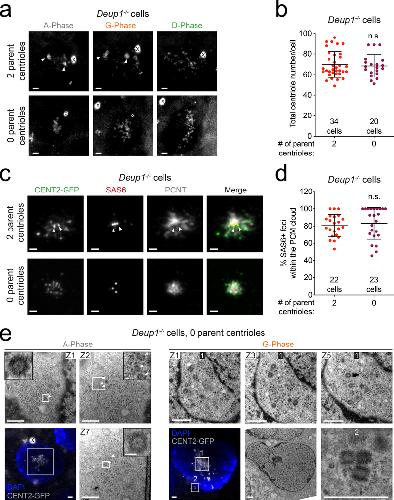 Fig. 6. Centriole amplification can occur without deuterosomes and parent centrioles.(a) Images from videos of Centrin 2-GFP-expressing Deup1â/â ependymal cells transiently treated with centrinone to deplete the preexisting centrioles. Images show cells with 2 (Supplementary Video 9) or 0 (Supplementary Video 10) parent centrioles. The phases of centriole amplification cannot be accurately determined in Deup1â/â cells with 0 parent centrioles. X marks Centrin 2-GFP aggregates25. Arrowheads mark the parent centrioles when present. Scale bars represent 2μm.(b) Centriole number in Centrin 2-GFP-expressing Deup1â/â ependymal cells. Quantifications were carried out using time-lapse imaging in D-phase cells that began centriole amplification with 2 or 0 parent centrioles. Each point represents a single cell. Total number of cells analyzed is indicated. n > 3 cultures/condition. P values, unpaired, two-tailed, Welchâs t-test. n.s. = not statistically significant (p > 0.05). Bars represent mean +/â SD.(c) Immunofluorescence images of Centrin 2-GFP-expressing Deup1â/â cultured ependymal cells treated with centrinone to deplete the parent centrioles. Images show cells with 2 or 0 parent centrioles. Arrowheads mark parent centrioles when present. Scale bars represent 2 μm.(d) Quantification of the percentage of SAS6+ foci localized within the PCM cloud in Centrin 2-GFP expressing Deup1â/â ependymal cells during the amplification phase of cells with either 2 or 0 parent centrioles. Quantification is based on the localization of SAS6 foci within the PCM cloud marked by PCNT staining. Each point represents a single cell. Total number of cells analyzed is indicated. n = ⥠2 cultures/condition. P values, unpaired, two-tailed, Welchâs t-test. n.s. = not statistically significant (p > 0.05). Bars represent mean +/â SD.(e) Correlative light and electron microscopy of Centrin 2-GFP-expressing Deup1â/â ependymal cells treated with centrinone to deplete the parent centrioles. (Left) A cell in amplification phase (left) and growth phase (right) are shown (Supplementary Video 11 and 12). Arrowheads mark procentrioles forming in the absence of preexisting centrioles and deuterosomes. They form as either single freestanding procentrioles (Box 1) or small groups of 2â3 procentrioles (Box 2). Scale bars represent 1 μm and 100 nm for the zoomed in regions of interest. |