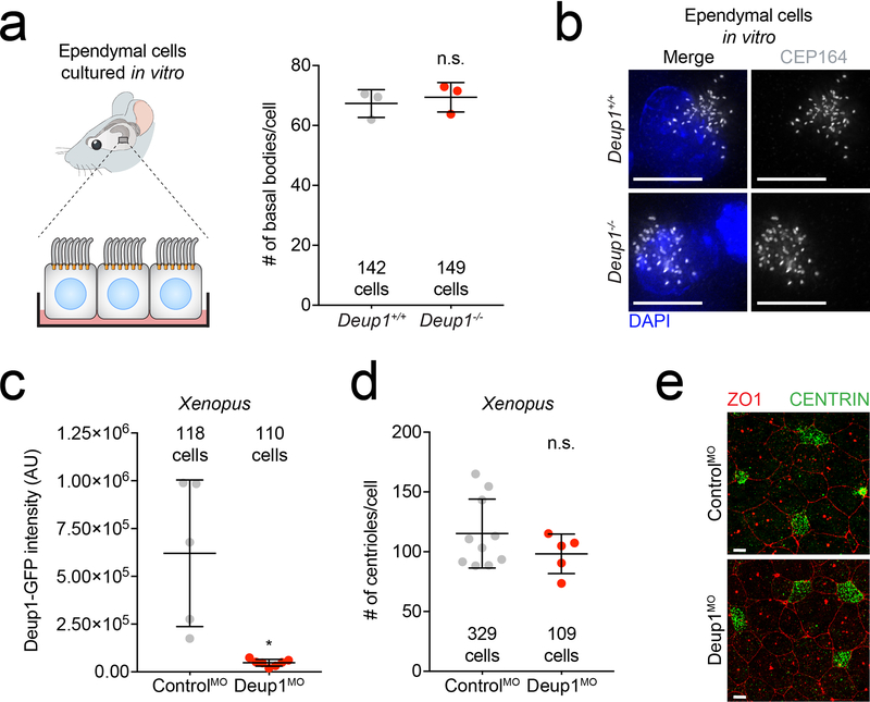 Extended Data Fig. 2:. DEUP1 is not required for centriole amplification.(a) Quantification of CEP164 foci which marks the mature basal bodies in control or Deup1â/â ependymal cells. The total number of cells analyzed per genotype is indicated. n = 3 mice/genotype. P values, unpaired, two-tailed, Welchâs t-test. n.s. = not statistically significant (p > 0.05). Bars represent mean +/â SD.(b) Representative images of mature centrioles in Deup1+/+ or Deup1â/â ependymal cells stained with an antibody against CEP164. Scale bars represent 10 μm.(c) Quantification of Deup1-GFP intensity in control or Deup1 morpholino treated Xenopus epithelial cells. Note, the Deup1 MO efficiently silenced expression of an mRNA encoding a morpholino-targetable fragment of Deup1 fused to GFP in Xenopus MCCs. n ⥠5 embryos per genotype. The total number of cells analyzed per condition is indicated. P values, unpaired, two-tailed, Welchâs t-test. * = p ⤠0.05. Bars represent mean +/â SD.(d) Quantification of centriole number in control or Deup1 morpholino treated Xenopus epithelial cells. Points represent the average number of centrioles per embryo. n ⥠5 embryos per genotype. The total number of cells analyzed per condition is indicated. P values, unpaired, two-tailed, Welchâs t-test. n.s. = not statistically significant (p > 0.05). Bars represent mean +/â SD.(e) Representative immunofluorescence images from control or Deup1 morpholino treated Xenopus epithelial cells stained with tight junction marker, ZO1, and centriole marker, Centrin. Scale bars represent 10 μm |