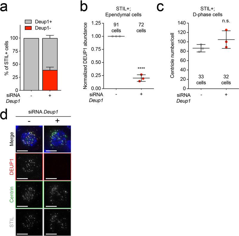Extended Data Fig. 3:. Deup1 siRNA does not suppress centriole amplification in MCCs.(a) Quantification of control or Deup1 siRNA treated cells undergoing centriole amplification that contained (DEUP1+) or lacked (DEUP1-) DEUP1 foci. To identify cells in the process of centriole amplification we immunostained for STIL, which localizes to immature procentrioles but is absent from mature basal bodies. n = 3 cultures/genotype.(b) Quantification of the intensity of DEUP1 signal in STIL+/DEUP1+ controls or STIL+/DEUP1- siRNA-treated cells. n = 3 cultures/genotype. The average intensity for the control siRNA sample was normalized to 1 for each experiment. n = 3 mice/genotype. P values, one sample t-test compared to a mean of 1. **** = p ⤠0.0001.(c) Quantification of centriole number in control and Deup1 siRNA-treated cells. Only STIL+ cells were quantified so that DEUP1 depletion could be monitored, and only cells depleted for DEUP1 (assessed by immunostaining) in the siRNA condition were quantified. n = 3 cultures/genotype. P values, unpaired, two-tailed, Welchâs t-test. n.s. = not statistically significant (p > 0.05).(d) Representative images of control ependymal cells and cells with siRNA-mediated depletion of DEUP1. Scale bars represent 10 μm. |