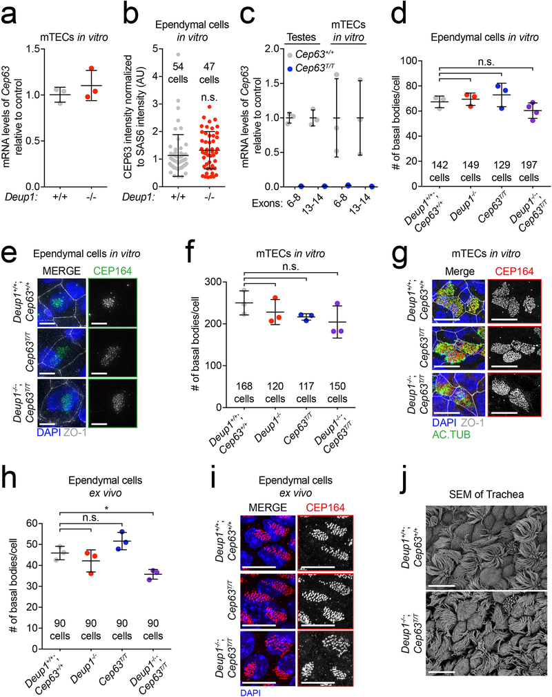 Extended Data Fig. 5:. CEP63 modestly affects centriole amplification in Deup1â/â MCCs.(a) RT-qPCR analysis of Cep63 mRNA levels in Deup1+/+ and Deup1â/â mTECs. n = 3 mice/genotype. The average of Deup1+/+ samples was normalized to 1.(b) Quantification of CEP63 protein levels in ependymal cells in the amplification phase. To account for differences in the number of procentrioles present in each cell, CEP63 levels were normalized to the abundance of the procentriole marker SAS6. n = 3 cultures/genotype.(c) RT-qPCR analysis of Cep63 mRNA levels in testes and mTECs from Cep63+/+ and Cep63T/T mice using two different primer sets. The average of Cep63+/+ samples was normalized to 1. n = 3 mice/genotype.(d) Quantification of CEP164 foci which marks basal bodies in cultured mature ependymal cells. Data from Deup1+/+ and Deup1â/â cultures are from Extended Data 2a and shown for comparison. n = 3 cultures/genotype.(e) Representative images of mature basal bodies using an antibody against CEP164 in mature ependymal cells.(f) Quantification of CEP164 foci in mature mTECs. Data from Deup1+/+ and Deup1â/â cultures are from Fig. 2a and shown for comparison. n = 3 cultures/genotype.(g) Representative images from mature mTECs. DAPI marks the nuclei, acetylated-tubulin (AcTub) marks cilia, ZO-1 marks tight junctions and CEP164 stains basal bodies.(h) Quantification of the basal body marker CEP164 foci in adult brain sections. Data from Deup1+/+ and Deup1â/â mice are from Fig. 2c and shown for comparison. n = 3 mice/genotype.(i) Representative images of ependymal cells in adult brain sections. DAPI marks the nuclei, ZO-1 marks tight junctions and CEP164 stains basal bodies.(j) Scanning electron micrographs of trachea from control or Deup1â/â; Cep63T/T adult mice. All scale bars represent 10 μm. All bars represent mean +/â SD. All P values are from unpaired, two-tailed, Welchâs t-test. n.s. = not statistically significant (p > 0.05), * = p ⤠0.05. |
