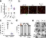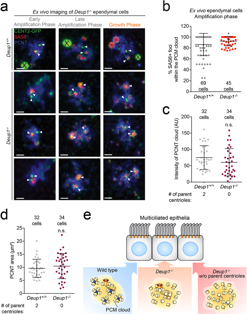 Extended Data Fig. 7:. Procentrioles are amplified within a cloud of PCNT in both Deup1+/+ and Deup1â/â cells with or without parent centrioles.(a) Immunofluorescence images of Centrin 2-GFP-expressing Deup1+/+ and Deup1â/â ependymal cells. Brain sections were stained with antibodies against the procentriole protein SAS6 and pericentriolar material protein PCNT. X marks Centrin 2-GFP aggregates. Arrowheads point to parent centrioles. Scale bars represent 1 μm.(b) Quantification of the percent of SAS6+ foci observed within the PCM cloud in Deup1+/+ and Deup1â/â ependymal cells during the amplification phase in vivo. n = 3 mice/genotype. Each point represents a single cell. The total number of cells analyzed per genotype is indicated. P values, unpaired, two-tailed, Welchâs t-test. * = p ⤠0.05. Bars represent mean +/â SD.(c) Quantification of the intensity of the PCNT cloud in Deup1+/+ ependymal cells with 2 parent centrioles and in Deup1â/â ependymal cells with 0 parent centrioles during the amplification phase in vitro. n = 3 cultures/genotype. The total number of cells analyzed per genotype is indicated. P values, unpaired, two-tailed, Welchâs t-test. n.s. = not statistically significant (p > 0.05). Bars represent mean +/â SD(d) Quantification of the area of the PCNT cloud in Deup1+/+ ependymal cells with 2 parent centrioles and in Deup1â/â ependymal cells with 0 parent centrioles during the amplification phase in vitro. n = 3 cultures/genotype. The total number of cells analyzed per genotype is indicated. P values, unpaired, two-tailed, Welchâs t-test. n.s. = not statistically significant (p > 0.05). Bars represent mean +/â SD.(e) Model of centriole amplification in MCCs. (Blue) Wild type cells amplify centrioles on the surface of deuterosomes and the parent centrioles. (Orange) DEUP1 knockout cells achieve the correct number of centrioles through the massive production of centrioles on the surface and in the vicinity of parent centrioles. (Red) MCCs that lack parent centrioles and deuterosomes amplify the correct number of centrioles within the confines of a PCM cloud. |