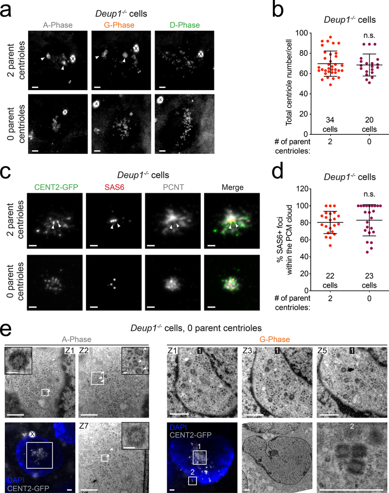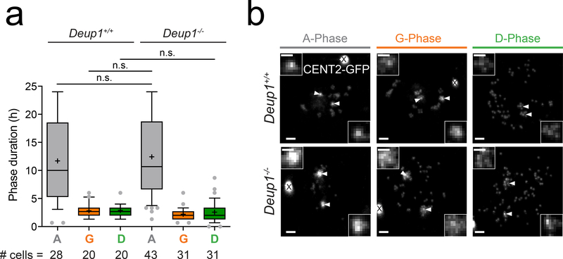 Fig. 3. Live-imaging of differentiating Deup1â/â ependymal cells reveals normal, step-wise kinetics of centriole amplification.(a) Box (25 to 75%) and whisker (10 to 90%) plots of A- (Gray), G- (Orange), and D- (Green) phase duration in differentiating Centrin 2-GFP Deup1+/+ and Deup1â/â ependymal cells using time-lapse microscopy. A = amplification phase, G = growth phase, D = disengagement phase; n > 3 cultures/genotype. The total number of cells per genotype at each phase (# cells) is indicated. P values, unpaired, two-tailed, Welchâs t-test. n.s.=not statistically significant (p > 0.05).(b) Still images from time-lapse videos of Centrin 2-GFP Deup1+/+ (Supplementary Video 1) or Deup1â/â (Supplementary Video 2) ependymal cells in the amplification (A), growth (G) or disengagement (D) phase. Arrow heads and zoomed regions mark the parent centrioles. X marks Centrin 2-GFP aggregates resulting from expression of the Centrin 2-GFP transgene25. Scale bars represent 2 μm. |