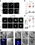 Fig. 4. Centriole amplification in the absence of deuterosomes occurs on, and in proximity to, pre-existing centrioles.(a) Immunofluorescence images of Centrin 2-GFP expressing Deup1+/+ and Deup1â/â ependymal cells in vivo (P2-P6). Brain sections were stained with antibodies against GT335, SAS6, and DEUP1. GT335 marks the cilium that forms from the older parent centriole, SAS6 marks new procentrioles and DEUP1 marks the deuterosome. X marks Centrin 2-GFP aggregates resulting from expression of the Centrin 2-GFP transgene25. Arrowheads indicate location of pre-existing centrioles. Scale bars represent 2 μm.(b) Correlative light and electron microscopy of a Centrin 2-GFP expressing Deup1+/+ ependymal cell in the growth phase. Procentrioles are formed by both parent centrioles (PC) and deuterosomes (Deut.). Bottom left shows an immunofluorescence image of the Centrin 2-GFP Deup1+/+ cell depicted in the EM images. Bottom right shows a schematic representation of the relative position of procentrioles formed on the parent centrioles. Scale bars represent 600 nm for the EM images and 5 μm for the immunofluorescence image. This cell is shown in Supplementary Video 3.(c) Correlative light and electron microscopy of a Centrin 2-GFP-expressing Deup1â/â cell reveals centriole amplification on, or in close proximity to, the parent centrioles (PC). Procentrioles are also observed further away in the cytoplasm. Bottom left shows an immunofluorescence image of the Centrin 2-GFP Deup1â/â cell depicted in the EM images. Bottom right shows a schematic representation of the relative position of procentrioles formed on the parent centrioles. Scale bars represent 600 nm for the EM images and 5 μm for the immunofluorescence image. This cell is shown in Supplementary Video 4 and 5. |