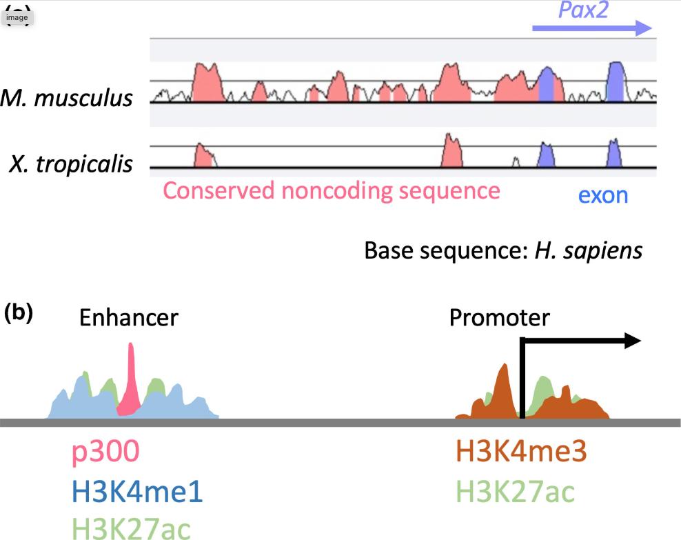 Figure 1. (a) Extraction of candidate enhancers using evolutionarily conserved noncoding sequences; plot using the comparative genomics alignment tool VISTA; comparison of human (Homo sapiens), mouse (Mus musculus), and frog (Xenopus tropicalis) Pax2 loci; the pink peak indicates the conserved noncoding sequences and the blue peak indicates exons. (b) Extraction of candidate enhancers based on epigenetic profiling of H3K4me1, H3K4me3, and H3K27ac, and the binding of histone acetyltransferase p300; H3K4me1, H3K27ac, and p300 are often associated with enhancers, whereas H3K4me3 and H3K27ac are often present at active promoters. The image was adapted and modified from Prescott et al. (2015) |