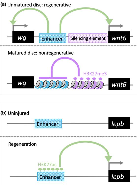 Figure 2. (a) Regenerative mechanisms of the damage response enhancer for Drosophila wing imaginal discs; Wg and Wnt6 expression are upregulated in response to damage via the damage response enhancer in unmatured discs. In contrast, immediately adjacent regulatory elements promote methylation of H3K27me3 across the Wnt gene cluster. This methylation event prevents regeneration of wing imaginal discs. The image was adapted and modified from Harris et al., (2016). (b) Genomic DNA regions surrounding the lepb gene and profiles of H3K27ac in uninjured and regenerating hearts; transgenic analyses showed that H3K27acârich elements have enhancer activity in regenerating zebrafish hearts |