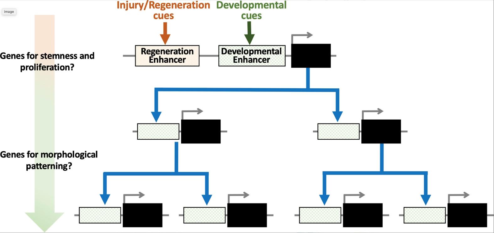 Figure 4. Injury/regeneration‐specific enhancers and developmental enhancers; genes that initiate the developmental cascade may have injury/regeneration‐specific enhancers. In contrast, genes located downstream of the cascade may reuse developmental enhancers for regeneration |
