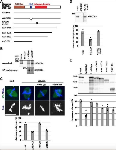 Figure 7. The microtubule-binding region of RECQL4 is required for chromosome alignment. (A) Schematic representation of Xenopus RECQL4 and constructs used in add-back reactions. The position of the N-terminal Sld2-like domain, involved in DNA replication, the NLS, and the helicase domain are indicated. The Î546â594 mutant lacks the NLS region. The K758M point mutant is a known helicase-defective RECQL4 version (Rossi et al, 2010). (B) RECQL4-depleted (ÎRECQL4) CSF extract was incubated with wild-type or Î546â594 mRNAs for 90 min. Expression of the recombinant proteins were confirmed by Western blotting using Xenopus antibodies. The resulting extracts were used for microtubule (MT) binding assay. (C) Sperm was incubated in control (mock) or RECQL4-depleted (ÎRECQL4) CSF extracts supplemented with the indicated mRNAs for cycled spindle assembly in the presence of Alexa 488-labled tubulin. At the end of the reaction, samples were fixed and stained with DAPI for microscopy. Chromosome alignment was quantified analyzing all bipolar spindle structures identified. Columns show the average of three independent experiments and circles indicate individual data points. Scale bar, 20 μm. (D) Cycled spindles assembled as in (C) but with the helicase-defective K758M mutant. Depletion and add-back efficiency was analyzed at the end of the assay by Western blotting. Chromosome alignment was quantified. Columns show the average of two independent experiments and circles indicate individual data points. (E) Cycled spindles assembled as in (C) but supplemented with mRNA encoding for wild-type or different C-terminal RECQL4 truncations. Depletion and add-back efficiency was analyzed at the end of the assay by Western blotting. Chromosome alignment was also quantified. Columns show the average of at least two independent experiments and circles indicate individual data points. |