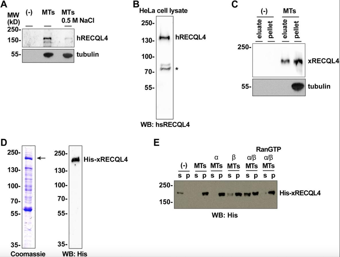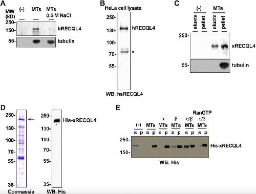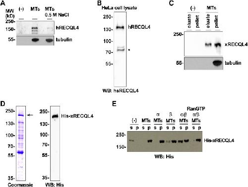 Figure S1. RECQL4 is a RanGTP dependent MAP. (A) Endogenous human RECQL4 binds to microtubules (MTs) in a salt-sensitive manner. HeLa nuclear extract was incubated in the presence or absence of taxol-stabilized MTs and 0.5 M NaCl and centrifuged. MT pellets were immunoblotted using human RECQL4 and α-tubulin antibodies. (B) Preparation of human RECQL4 antibody. Recombinant human RECQL4 aa 1â831 was expressed in bacteria, purified, and used for antibody production in rabbits. The generated antibody detected endogenous hRECQL4 in HeLa cell lysate. *, nonspecific band. (C) Endogenous Xenopus RECQL4 binds to MTs. Xenopus CSF egg extract was incubated with taxol-stabilized MTs. MTs and MAPs were spun down. MAPs are eluted from MTs with high salt and separated by centrifugation. The eluate and MT pellet were immunoblotted. (D) Recombinant Xenopus RECQL4 expressed in insect cells and purified with TALON beads. Coomassie staining and Western blot (WB) using an anti-His 6-antibody are shown. (E) Xenopus RECQL4 binds to MTs in a RanGTP-regulated manner. Recombinant RECQL4 was incubated with MTs as in Fig 1B, but, where indicated, in the presence of recombinant importin α, importin β, and/or RanQ69L mutant loaded with GTP (RanGTP). After centrifugation, supernatant (s) and pellet (p) were analyzed by Western blot. |