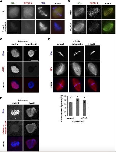 Figure S3. Inhibition of DNA replication and induction of DNA damage does not cause chromosome misalignment. (A) Spindles were assembled by incubation of sperm chromatin in CSF extracts in the presence of Alexa 488-labled tubulin (green in overlay). Cy3-labeled Xenopus RECQL4 antibody (red in overlay) and, where indicated, 6 μg/ml nocodazole to depolymerize microtubules was added to the reactions 10 min before fixation. DNA was stained with DAPI. (B) RECQL4 localizes on Ran-induced spindle-like microtubule (MT) structures. Mock or RECQL4-depleted CSF extract was incubated with RanQ69L-GTP and Alexa 488-labled tubulin. Cy3-labeled Xenopus RECQL4 antibody was added and incubated for 10 min. Samples were then fixed. Scale bar, 10 μm. (C) Inhibition of DNA replication by aphidicolin. Nuclei were assembled in interphase extract supplemented with Cy3-labeled dUTP in the presence or absence of aphidicolin. Scale bar, 20 μm. (D) Bipolar spindles were assembled in the cycled extracts containing Cy3-labled tubulin in the presence or absence of aphidicolin or EcoRI that induces DNA damage. Chromosome alignment was quantified taking all bipolar spindles into account as in Fig 3E. Columns show the average of three independent experiments and circles indicate individual data points. Scale bar, 20 μm. (E) Sperm chromatin was incubated in the interphase extract in the absence or presence of EcoRI. Samples were fixed, spun down on coverslips, and stained for a DNA damage marker, phospho-Histone H2AX. Scale bar, 20 μm. |