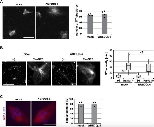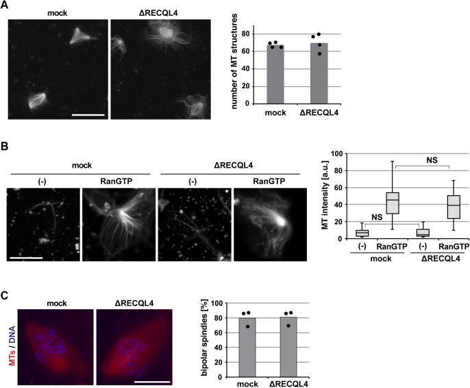 Figure S4. RECQL4 is not required for spindle microtubule assembly. (A) Ran-induced microtubule (MT) assembly in CSF extract. Mock or RECQL4-depleted CSF extract was incubated with RanQ69L-GTP in the presence of Cy3-labled tubulin. After spindle assembly, samples were fixed, spun down on coverslips, and analyzed by confocal microscopy. The number of MT structures was counted in 100 randomly selected fields with a 63à objective. Columns show the average of four independent experiments and circles indicate individual data points. Scale bar, 10 μm. (B) Centrosomal asters were assembled in mock or RECQL4-depleted CSF extract in the presence of Cy3-labled tubulin and purified centrosomes in the presence or absence of RanQ69L-GTP. Samples were fixed, spun down on coverslips, and analyzed by confocal microscopy. MT intensity was quantified. n > 20 structures. NS (not significant) P > 0.05 (t test, two-tailed). (C) DNA-bead spindles were assembled around DNA-coated beads in cycled extract supplemented with Cy3-labled tubulin. After assembly, samples were fixed, stained with DAPI, and analyzed by confocal microscopy. Frequency of bipolar spindles was determined on more than 50 DNA bead clusters, containing 15â40 beads, per experiment and condition. Columns show the average of three independent experiments and circles indicate individual data points. Scale bars, 20 μm. |