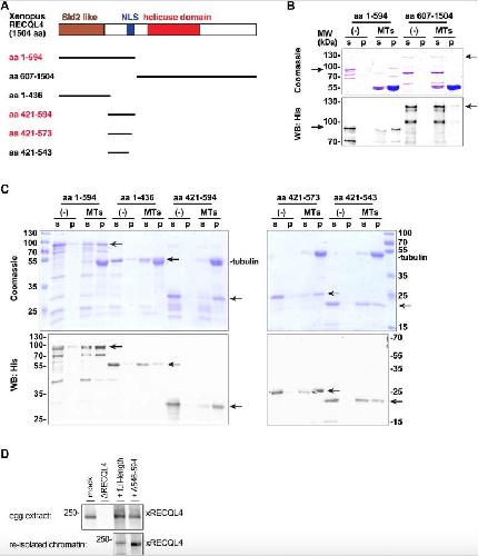 Figure S5. The NLS region of RECQL4 binds to microtubules. (A) Xenopus RECQL4 domain structures, and recombinant fragments expressed and purified. The proteins labeled in red bound strongly to microtubules (MTs), as shown in (B) and (C). (B) The N-terminal (aa 1â594) and C-terminal (aa 607â1,504) fragments of Xenopus RECQL4 were incubated in the absence or presence of MTs. After centrifugation, the supernatant (s) and pellet (p) were analyzed by Coomassie staining or Western blot (WB) against His6-tag. The respective fragments are indicated by arrows. (C) Different RECQL4 fragments in the N-terminal part of the protein were analyzed for MT interaction as in a (B). (D) Sperm chromatin was incubated with interphase RECQL4-depleted extract supplemented with mRNA encoding wild-type REQL4 or the deletion mutant (Î546â594). Chromatin was re-isolated by centrifugation and analyzed by immunoblotting (lower panel). To check for efficient translation of the added mRNA, control (mock), RECQL4-depleted (ÎRECQL4) extracts, and RECQL4-depleted supplemented with mRNAs are analyzed in the top panel. |