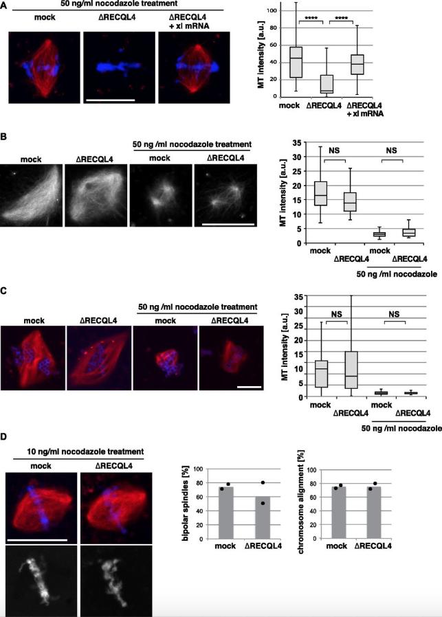 Figure 5. RECQL4 is required for microtubule stability. (A) RECQL4 is required for microtubule (MT) stability. Cycled spindles were assembled as in Fig 3C and D and treated with 50 ng/ml nocodazole for additional 10 min. Samples were fixed, stained with DAPI, and analyzed by confocal microscopy. MT intensity was quantified from two independent experiments with more than 30 chromatin structures per condition. ****P < 0.0001 (t test, two-tailed). (B) RanGTP-induced spindles were assembled in CSF extracts and treated with or without 50 ng/ml nocodazole for an additional 10 min. Samples were fixed and analyzed. MT intensity was quantified on more than 20 spindle-like structures per condition. NS (not significant) P > 0.05 (t test, two-tailed). (C) DNA-bead spindles were assembled in cycled extracts and incubated with or without 50 ng/ml nocodazole for an additional 10 min. Samples were fixed, stained with DAPI, and analyzed by confocal microscopy. MT intensity was quantified on more than 30 DNA bead clusters, each containing 15â40 beads. NS (not significant) P > 0.05 (t test, two-tailed). (D) Low concentrations of nocodazole rescue the chromosome misalignment observed upon RECQL4 depletion. Cycled spindles were assembled and subsequently treated with 10 ng/ml nocodazole for additional 10 min. Samples were fixed and analyzed by confocal microscopy. Frequency of bipolar spindles was counted taking all chromatin structures into account. Chromosome alignment was quantified analyzing all bipolar spindle structures identified. Columns show the average of two independent experiments and circles indicate individual data points. Scale bars, 20 μm. |