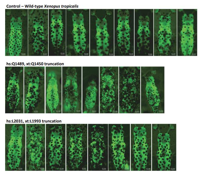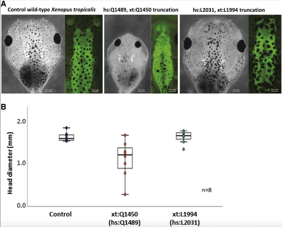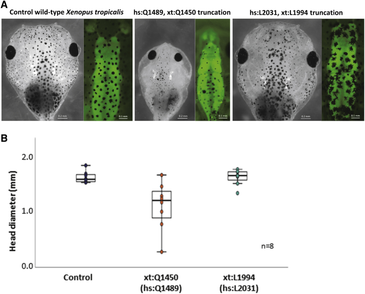 Figure 5. Truncation in the TRIO GEFD1 Reduces Head Size in X. tropicalis (A) X. tropicalis eggs from a single female for each of two biological replicates (with parents from different genetic backgrounds) were fertilized with frozen sperm and injected at the one-cell stage with CRISPR-Cas targeting the genome as shown. Representative micrographs for each condition are shown (black and white photos) (all tadpoles are shown in Figure S3). Performing the GEFD1 and GEFD2 frameshift in a tubb2B.GFP X. tropicalis showed that forebrain deformities had occurred in 6/8 GEFD1 truncation tadpoles, which was not the case for GEFD2 frameshift. Representative micrographs for each condition are shown (color photos) (all tadpoles are shown in Figure S4). (B) Comparing the head diameter of the tadpoles carrying truncations in the GEFD1 (hs: Gln 1489â = xt Gln 1450) and GEFD2 (hs: Leu 2031â = xt Leu 1994) domains showed that GEFD1 truncations caused microcephaly, whereas GEFD2 truncations had no effect. Quantification is shown for eight individuals measured (all tadpoles are shown in Figure S3). |