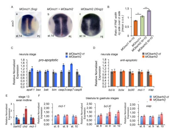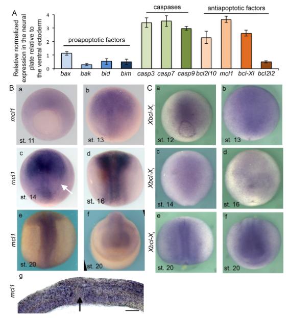 Figure 2: mcl1 expression pattern suggests a role for this protein in axial organizer development. (A) RT-qPCR analysis of apoptotic cascade mRNA in Xenopus early neurula. Analysis performed on RNA extracted from dissected neural plates, and ventral ectoderms (N=15) of X. laevis embryos at stage (st.) 14 for pro-apoptotic factors â bak, bad, bid, bim, including caspases (casp) - casp3, casp7, and casp9 and anti-apoptotic factors â bcl2l10, mcl1, bcl-xl, and bcl2l2. Expression is normalized relative to ef1α. Relative normalized expression is indicated as means ± s.e. (B) mcl1 expression pattern. ISH using a probe for mcl1 from stage 11 to stage 20 embryos; (a) ventral view, dorsal up, (b-e) dorsal view anterior up, (f) anterior view dorsal up. (g) Transverse section of (c) in the posterior part of the embryo. The scale bar stands for 200μm. The white arrow indicates the border between the ectoderm and the neuroectoderm. The black arrow indicates the notochord. (C) bcl-xl expression pattern in X. laevis gastrula and neurula. ISH using a probe for the anti-apoptotic gene bcl-xl from stage 12 to stage 20. Embryos are shown dorsal side up. |