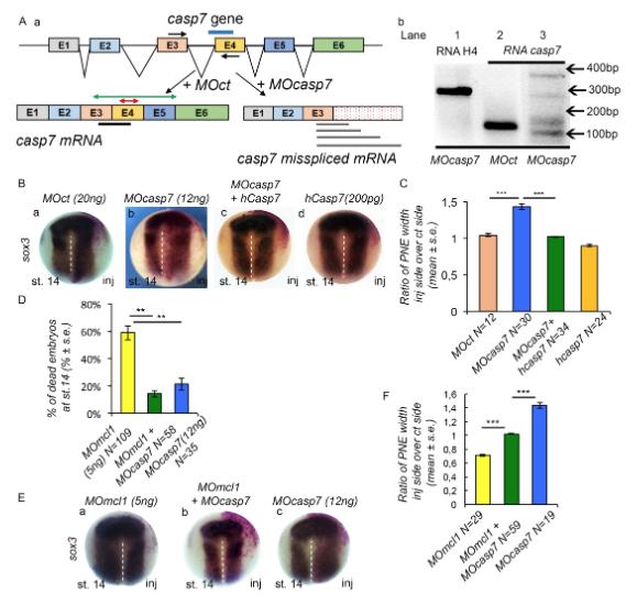 Figure 5: Depletion of caspase-7 compensates for Mcl1 depletion. (A) (a) Schematic representation showing the genomic organization of the caspase-7 gene (casp7) in X. laevis. The region targeted by the splice-blocking MO casp7 (MOcasp7) is shown (blue line). The two black arrows indicate the location of the two primers used to amplify exon3 (E3) and exon4 (E4) sequences in the RT-PCR analysis (b). The substrate pocket (green double end arrow) and the active site (red double end arrow) are shown. (b) MOcasp7 efficacy was validated by RT-PCR using primers as indicated in (a). Total RNA was isolated from stage (st.) 14 MOcasp7 or control MO (MOct)- injected embryos and analyzed using E3-E4 casp7 primers (a). Misspliced casp7 mRNA forms are observed in MOcasp7 injected embryos compared to the normally spliced casp7 mRNA detected in the MOct- injected embryos (Lanes 2 and 3). Histone H4 is used as an internal control and normally spliced in MOcasp7 injected embryos (Lane 1). (B) Depletion of Casp7 increases neuroepithelium width. ISH of st. 14 embryos using probes against sox3 (a-d). Embryos injected with (a) MOct (N=12); (b) MOcasp7 (N=30); (c) MOcasp7 together with human casp7 (hcasp7) (N=34) and (d) hcasp7 (N=24) at the indicated doses are shown dorsal view anterior up. (C) Quantification of B. (D-F) Casp7 depletion rescues Mcl1 depletion apoptotic phenotypes. (D) Percentage of dead embryos at st. 14 was calculated on MOmcl1 (N=109), MOmcl1 together with MOcasp7 (N=58), and MOcasp7 (N=35) injected embryos. (E) ISH using probes against sox3 on embryos injected with (a) MOmcl1 (N=29); (b) MOcasp7 and MOmcl1 (N=59), or (c) MOcasp7 (N=19). Representative embryos at st. 14 are shown dorsal view anterior up. (F) Quantification of E. PNE stands for posterior neuroepithelium. The dashed white line indicates the midline. N represents the number of embryos. Relative normalized expression is indicated as means ± s.e. ** p<0.01 , *** p<0.001. |