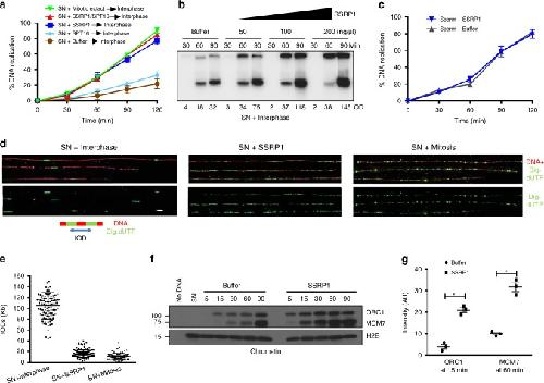 Fig. 2. SSRP1-dependent stimulation of replication origin assembly.a Graph showing replication time course of SN (4000 n/μl) replication. SN were pre-incubated for 30âmin with buffer, 200âng/μl recombinant SSRP1, SPT16 or both, as indicated, and transferred to interphase extracts (Interphase) or pre-incubated in CSF-arrested mitotic egg extract for 30âmin (Mitotic) then driven into interphase by CaCl2 addition. Each point represents the meanâ±âSEM. nâ=â3 independent experiments; pâ<â0.0001 when comparing mean values for all samples; Two-way anova. b Representative autoradiography of a DNA replication time course assay in interphase egg extract showing α-32P-dCTP incorporation in SN. Optical density (OD) for each lane is indicated. c Graph showing replication time course of sperm nuclei (8000 n/μl) treated as indicated. Each point represents meanâ±âSEM. nâ=â3 independent experiments; pâ=âns when comparing mean values for all samples; Two-way anova. d DNA fiber assay showing digoxigenin-dUTP (dig-dUTP) incorporation in SN incubated directly in interphase egg extract together with buffer (left), pre-incubated with 200âng/μl recombinant SSRP1 (center) or pre-incubated for 30âmin in CSF-arrested mitotic egg extract then driven into interphase by CaCl2 addition (right). DNA fibers are in red. Dig-dUTP labeled tracts are in green. Barâ=â10âKb. e Graphs showing IODs indicated in Kb for each sample. The center-to-center distances between adjacent Dig-dUTP tracks were measured and plotted analyzing 50 fibers pooled from three independent experiments; IODs and mean valuesâ±âSEM are shown; nâ=â100 individual IODs; pâ<â0.0001; Two-way anova. f Chromatin binding showing somatic nuclei incubated in interphase extract in the presence of buffer or recombinant SSRP1. Chromatin was isolated at the indicated times after addition to egg extract and blotted using the indicated antibodies. No DNA indicates absence of nuclei. SN indicates somatic nuclei alone. Image shows typical result. g Graph showing relative quantification of signal intensity of ORC1 and MCM7 proteins loaded on chromatin at the indicated times normalized to histone H2B. Bars represent mean intensityâ±âSEM. nâ=â3 independent experiments; pâ<â0.0005 when comparing mean values for ORC1 and MCM7; t-test. |