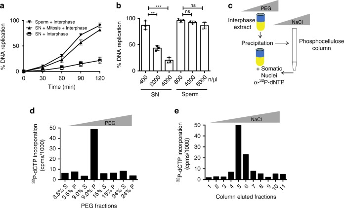 Fig. 1. Isolation of SSRP1 as somatic nuclei replication stimulating factor.a Graph showing DNA replication kinetics of sperm (8000 n/μl) or somatic nuclei (SN) (4000 n/μl). DNA was directly incubated in interphase egg extract (Interphase) or exposed for 30âmin to CSF-arrested mitotic extract, which was then driven into interphase by 0.4âmM CaCl2 addition (Mitosisâ+âInterphase). DNA synthesis was quantified by measuring the percentage of α-32P-dCTP incorporation relative to the input DNA for each condition. Each point represents the mean valueâ±âstandard error of the mean (SEM). nâ=â3 independent experiments; pâ<â0.0001 when comparing mean values for all points; Two-way anova. b Graph showing DNA replication of the indicated amounts of sperm and SN directly incubated in interphase egg extract for 120âmin. DNA synthesis was quantified as in (a). Bars represent meanâ±âSEM. nâ=â3 independent experiments; **pâ<â0.01, ***pâ<â0.001 or ns when comparing mean values for the indicated samples; unpaired t test. c Schematic representation of Xenopus egg extract fractionation. Extract was precipitated by centrifugation following incubation with increasing amount of polyethylene glycol (PEG). Either pellet (P) or supernatant (S) fractions collected at different PEG concentrations were assayed for their ability to stimulate replication when incubated with SN then transferred to interphase extracts in the presence of radiolabelled nucleotide. d Graph showing α-32P-dCTP incorporation (counts per minute, cpms) in SN pre-incubated with the indicated PEG fractions for 30âmin and then transferred to interphase egg extract for 120âmin. e Graph showing α-32P-dCTP incorporation in somatic nuclei pre-incubated with the fractions eluted from the column as described in (c) loaded with the active PEG fraction (9%P) and then transferred to interphase egg extract for 120âmin. |