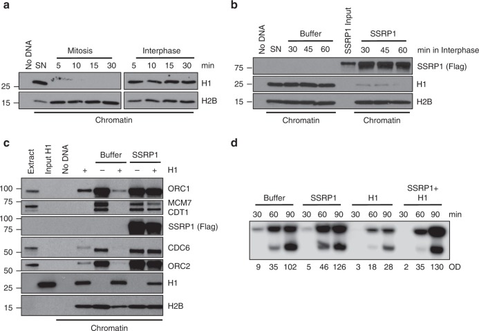 Fig. 3. SSRP1 counteracts histone H1-dependent inhibition of origin assembly.a Western blot (WB) of the indicated proteins bound to chromatin isolated from SN incubated with mitotic or interphase extracts for the indicated times. b WB of the indicated proteins bound to chromatin isolated from SN pre-incubated with 200âng/μl recombinant SSRP1 or control buffer and transferred to interphase extracts for the indicated times. SSRP1 input is 10% of the total. c WB of chromatin isolated from interphase egg extracts supplemented with sperm nuclei pre-incubated with buffer (â) or purified histone H1 (+) at a final concentration of 2âμM for 30âminâin the presence of 200âng/μl recombinant SSRP1 or control buffer and probed with the indicated antibodies. d Representative autoradiography of replication time course assay. Sperm nuclei were pre-incubated for 30âmin with 200âng/μl recombinant SSRP1, 2âμM histone H1, or both and then transferred to interphase extracts. Samples were taken at the indicated times after nuclei and α-32P-dCTP addition to egg extracts. OD for each lane is indicated. Images in all figures show a typical result of experiments repeated at least three times. |