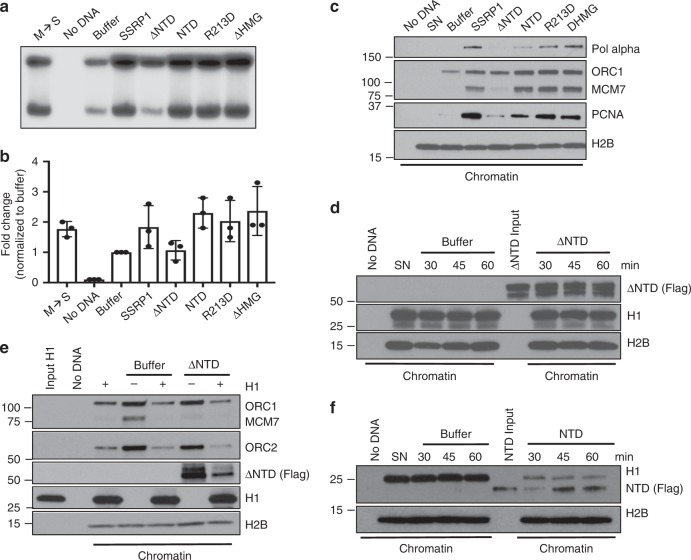 Fig. 5. SSRP1 N-Terminal domain dependent stimulation of DNA replication through histone H1 chromatin eviction.a Representative autoradiography of a DNA replication assay showing α-32P-dCTP incorporation for 120âmin in SN pre-incubated with 200âng/μl recombinant SSRP1 or equimolar amounts of its mutated versions, as indicated. b Graph indicating fold change in somatic DNA replication efficiency relative to buffer considered as 1. SN were pre-incubated with 200âng/μl recombinant SSRP1 or equimolar amounts of its mutated versions as indicated. Bars represent meanâ±âSEM. nâ=â3 independent experiments; pâ<â0.005 when comparing all values. Two-way anova. c WB of chromatin isolated at 60âmin after addition to interphase egg extracts of SN pre-incubated with 200âng/μl recombinant SSRP1 or equimolar amounts of its mutant versions and probed with the indicated antibodies. d WB of chromatin isolated at the indicate times from interphase egg extracts supplemented with SN pre-incubated with Flag-âNTD or control buffer. e WB of chromatin isolated from interphase egg extracts incubated for 60âmin with SN exposed to Flag-NTD or control buffer in the presence or absence of purified histone H1. f WB of chromatin isolated at the indicate times from interphase egg extracts incubated with somatic nuclei exposed to Flag-NTD or control buffer. |
