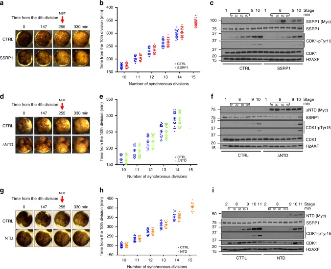 Fig. 6. SSRP1 induced delay of MBT onset.a Time lapse video frames taken from movie S1 at the indicated times from the 4th cleavage (set as time zero) of embryos injected at the one-cell stage. Top row: control buffer (CTRL) injected embryos; Bottom row: embryos injected with Myc-SSRP1 mRNA. Size barâ=â500âμm. b Graph showing the number of synchronous divisions-only of 24 embryos injected with Myc-SSRP1 mRNA or buffer and monitored up to 450âmin from fertilization. Only cleavages after the 10th are shown to simplify graph layout. Each dot represents one embryo. Bars show meanâ±âSEM. c WB using the indicated antibodies of whole embryos injected with Myc-SSRP1 mRNA or buffer and taken at the indicated stages. Stage 8 was sampled every 30âmin. d Images taken as in (a) from time-lapse movie S2. Embryos injected with control buffer or Myc-âNTD mRNA. Size barâ=â500âμm. e Graph showing the number of synchronous divisions monitored as in (b) of embryos injected with buffer or Myc-âNTD mRNA. f WB of whole embryos injected with Myc-âNTD mRNA or buffer and taken as in (c). g Images taken as in (a) from time-lapse movie S3 of embryos injected with control buffer or NTD mRNA. Size barâ=â500âμm. h Graph showing the number of synchronous divisions monitored as in (b) of embryos injected with control buffer or Myc-NTD mRNA. i WB of whole embryos injected with control buffer or Myc-NTD mRNA taken as in (c). |