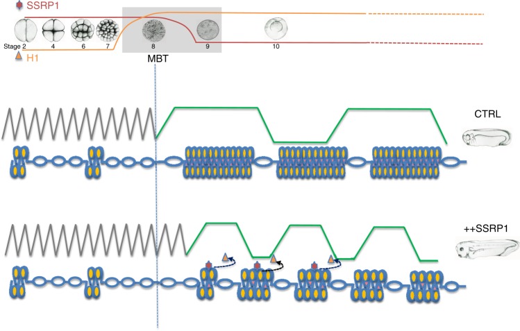 Fig. 8. Proposed model.In vitro SSRP1 suppresses histone H1 chromatin association and histone H1-mediated inhibition of DNA replication origins assembly. In vivo SSRP1 levels decrease around MBT when somatic forms of histone H1 start to be expressed. Overexpression of SSRP1 delays MBT onset. Persistent expression of SSRP1 in post-MBT embryos promotes faster somatic cell cycles and accelerated development. See text for more details. |