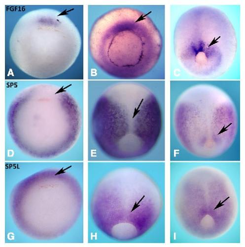 Fig. 2. Expression analysis FGF16, sp5 and sp5l in gastrula stage X.laevis em- bryos. In situ hybridisation analysis was used to detect transcripts for FGF16 (A-C), sp5 (D-F), and sp5l (G-I) during gastrulation. Stages 10 posterior/vegetal (A, D, G) 11 posterior/vegetal view (B, E, H) and 12 (C, F, I) posterior view. Arrow indicates dorsal blastopore lip in all panels.