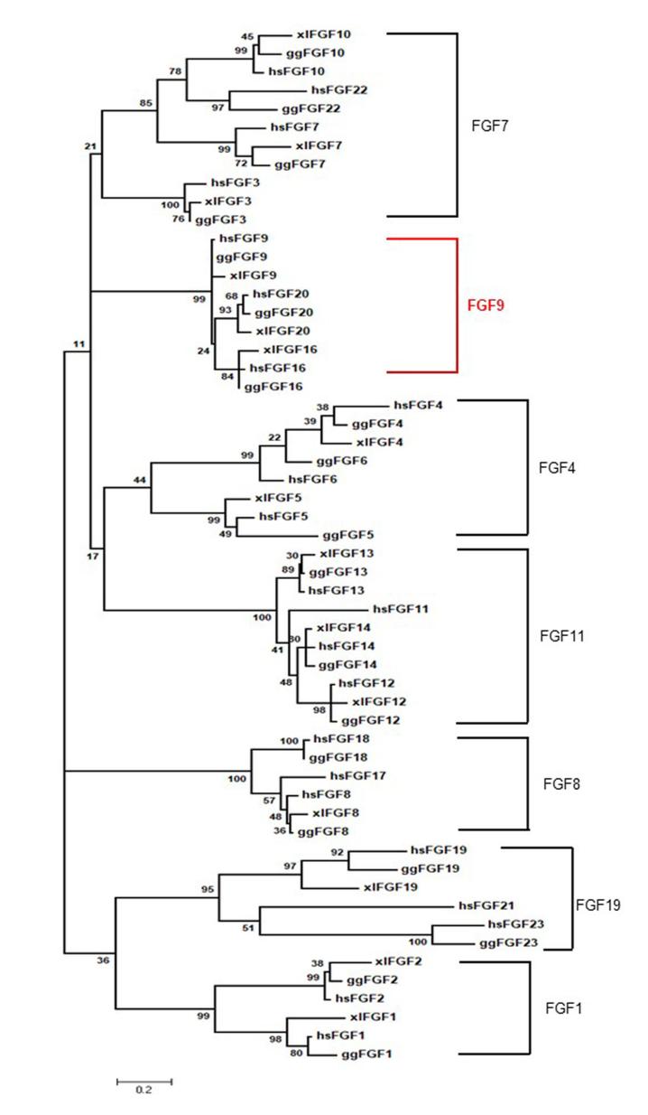 Fig. 1. Phylogenetic analysis of predicted FGF families. FGF family groupings are represented by brackets. Bold red brackets indicate the FGF9 subfamily: FGF9, FGF16 and FGF20. Protein sequences were aligned using MUSCLE. The evolutionary history was inferred by using the Maximum Likelihood method based on the Jones-Taylor-Thornton (JTT) matrix-based model (Jones et al., 1992). The percentage of trees in which the associ- ated taxa clustered together is shown next to the branches (500 bootstrap support). The tree is drawn to scale, with branch lengths measured in the number of substitutions per site. Labels are as follows: xl = Xenopus laevis; gg = Gallus gallus; hs = Homo sapiens.