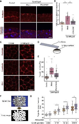 (C) Embryos centrifuged at 450 à g for 10 min, and control embryos were stained with fluorescent phalloidin and with anti-C-cadherin and anti-ZO-1 antibodies. Scale bar: 50 μm.