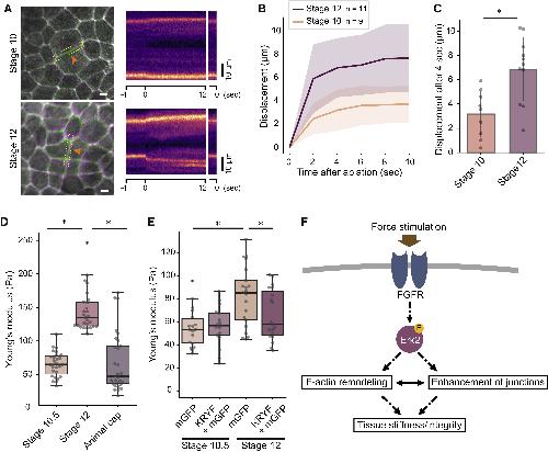 (F) Graphical summary. Our results demonstrate that the application of mechanical force to ectodermal cells in Xenopus embryos activates FGFR in a ligand-independent manner, subsequently activating the Erk2 signaling pathway. This mechanotransduction induces F-actin remodeling and enhancement of cell junctions, which in turn regulate tissue stiffness and integrity.