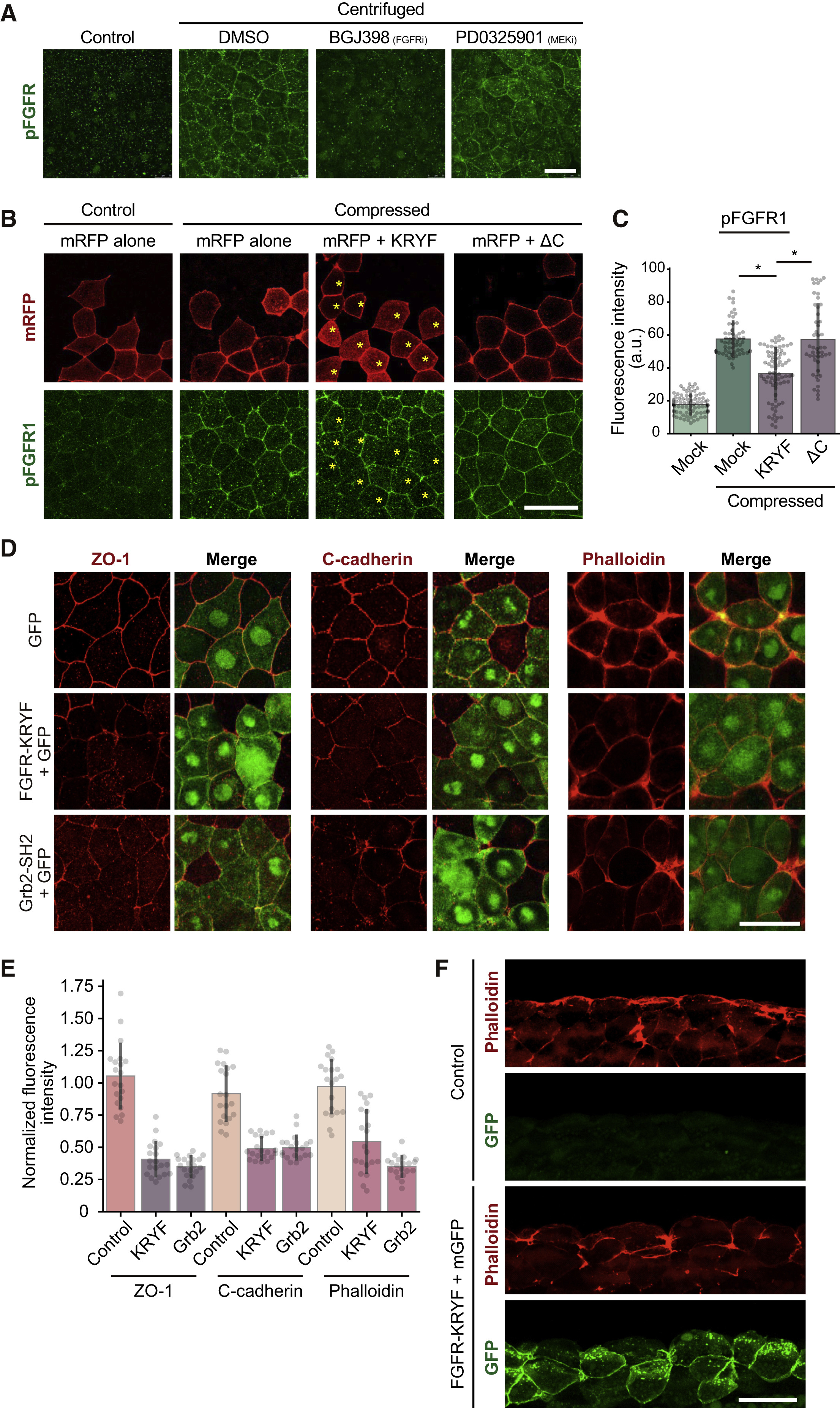 (D) mRNAs encoding FGFR-KRYF or Grb2-SH2 were co-injected with GFP mRNA at the four-cell stage. Embryos were centrifuged at 450 à g for 10 min and stained with indicated antibodies or phalloidin. Scale bar: 50 μm.