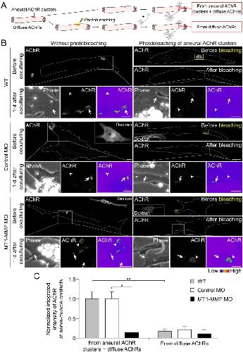 Figure 9. Postsynaptic MT1-MMP is required for the recruitment of aneural AChR clusters to the assembly of synaptic AChR clusters.(A) A schematic diagram illustrating the use of laser-based photobleaching approach to differentially identify the contribution of aneural AChR clusters and diffuse AChRs for the assembly of nerve-induced synaptic AChR clusters. (B) Representative images showing the differential contribution of aneural AChR clusters and diffuse AChRs to nerve-induced synaptic AChR clusters in control co-cultures (WT) and in the chimeric co-cultures of wild-type neurons and muscle cells with control MO or MT1-MMP MO. Yellow boxes (right panels) indicate the region of photobleaching. White boxes show a magnified view of nerve-muscle contacts in 1-d old co-cultures. Dotted lines highlight the periphery of muscle cells. Fluorescent dextran signals in the insets indicate the muscle cells with microinjected MO. 8-bit pseudo-color images highlight the relative fluorescence intensity of AChR signals. Arrows indicate synaptic AChR clusters at nerve-muscle contact sites. Arrowheads indicate the original location of aneural AChR clusters. (C) Quantification on the intensity of AChR signals at the nerve-muscle contacts in control co-cultures and in chimeric co-cultures either with or without photobleaching. The control groups without photobleaching indicate the contribution from aneural AChR clusters + diffuse AChRs, n = 15 (WT), 9 (Control MO), and 9 (MT1-MMP MO) nerve-muscle pairs from 3 independent experiments. The experimental groups with photobleaching of aneural AChR clusters indicate the contribution from diffuse AChRs only, n = 23 (WT), 13 (Control MO), and 8 (MT1-MMP MO) nerve-muscle pairs from 3 independent experiments. Scale bars represent 10 μm. Data are represented as mean ± SEM. Two-way ANOVA with Sidakâs multiple comparison test, *, ** represent pâ¤0.05 and 0.01 respectively. |