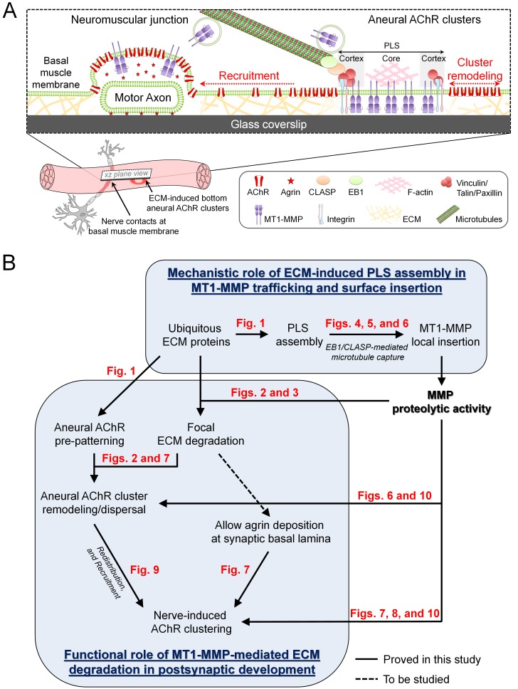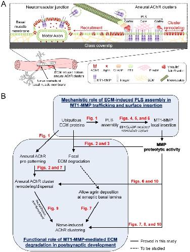 Figure 11. Working model on site-directed vesicular trafficking and surface delivery of MT1-MMP to regulate AChR cluster formation and remodeling.(A) Schematic diagram showing the proposed mechanisms underlying site-directed MT1-MMP trafficking and surface insertion for the regulation of focal ECM degradation and the recruitment of ECM-induced bottom aneural AChR clusters to nerve-induced synaptic clusters at developing NMJs. (B) Logical flow diagram proposing key events in the mechanistic role of ECM-induced PLS assembly in MT1-MMP trafficking and surface insertion, and the functional role of MT1-MMP-mediated ECM degradation in postsynaptic development. The relevant data presented in the main figures that support each of the individual proposed events are highlighted in red. |