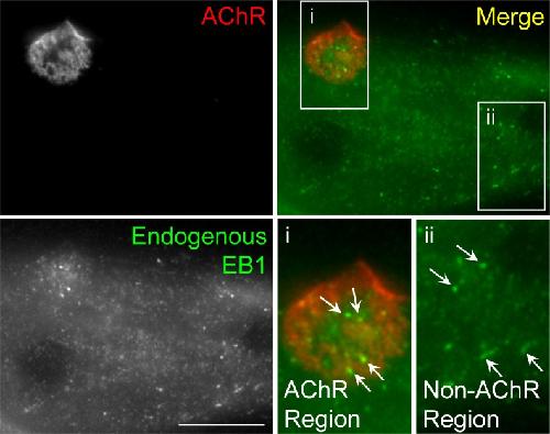 Figure 4—figure supplement 1. Immunostaining demonstrates the localization of endogenous EB1 in cultured Xenopus muscle cells.Representative images showing the localization patterns of endogenous EB1 proteins in fixed muscle cells. For clarity, two regions (AChR and non-AChR) were shown in the 2X magnified views. Similar to the localization of EB1-GFP, endogenous EB1 comets (arrows) were highly enriched in the perforated sites in AChR cluster region. Scale bar represents 10 μm. |