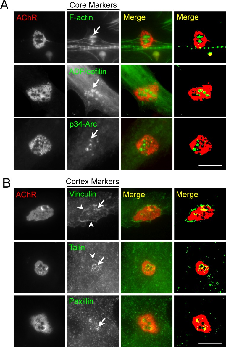 Figure 1âfigure supplement 2. PLS core and cortex markers are present at ECM-induced AChR clusters in Xenopus primary muscle cultures.(A) Representative images showing the localization of PLS core makers, including F-actin, ADF/cofilin, and p34-Arc, at the center of perforations (arrows) within aneural AChR clusters in muscle cells cultured on ECL-coated substrate. (B) Representative images showing the localization of PLS cortex makers, including vinculin, talin, and paxillin at the edge of perforations (arrows) or the periphery (arrowheads) of aneural AChR clusters. Scale bar represents 10 μm. |