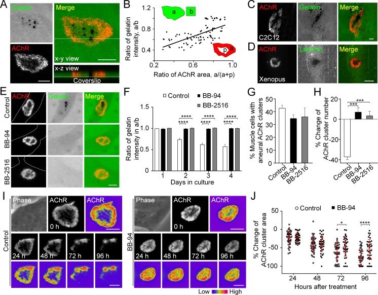 Figure 2. MMP-mediated ECM degradation regulates topological remodeling of aneural AChR clusters.(A) Representative confocal z-stack images showing the discrete and extensive degradation of fluorescent gelatin at the perforated regions within aneural AChR clusters. (B) Scatter plot analysis showing a positive correlation between the fluorescent gelatin intensity in perforated AChR clusters (a) divided by that in another region of the same cell (b) and the area of AChR-rich region (a) divided by that of the entire AChR clusters with perforations (a+p). R = 0.6458, p<0.0001. n = 84 from 3 independent experiments. (CâD) Representative images showing the degradation patterns of fluorescent gelatin (C) and laminin immunostaining (D) at AChR clusters in cultured C2C12 myotubes and Xenopus primary muscle cells, respectively. (E) Representative images showing the inhibitory effects of BB-94 or BB-2516 on fluorescent gelatin degradation. Dotted lines indicate the periphery of muscle cells. (F) Quantification on the extent of fluorescent gelatin degradation at the perforated regions of AChR clusters in control and BB-94/BB-2516-treated muscle cells over the first 4 consecutive days in culture. n > 280 muscle cells in each condition from 3 independent experiments. (G) Quantification on the effects of BB-94 or BB-2516 on the formation of bottom AChR clusters in cultured Xenopus muscle cells. n = 150 muscle cells in each condition from 3 independent experiments. (H) Quantification on the effects of BB-94 or BB-2516 on the stability of bottom AChR clusters in cultured Xenopus muscle cells. n = 166 (Control), 154 (BB-94), and 137 (BB-2516) muscle cells from 3 independent experiments. (I) Representative sets of time-lapse images showing the topological changes and fluorescence intensity of AChR clusters in control (left panels) and BB-94-treated (right panels) muscle cells. 8-bit pseudo-color images highlight the difference in AChR intensity at the same aneural clusters over 96 hr with or without BB-94 treatment. (J) An individual value plot showing the percentage change in the area of each aneural AChR clusters at different time-points between control and BB-94-treated cells. n = 43 (Control) and 38 (BB-94) muscle cells from 3 independent experiments. Data are represented as mean ± SD. Scale bars represent 5 μm. Data are represented as mean ± SEM, unless otherwise specified. Two-way ANOVA with Dunnettâs multiple comparisons test (F), one-way ANOVA with Dunnettâs multiple comparisons test (G and H), two-way ANOVA with Sidakâs multiple comparisons test (J), *, ***, **** represent pâ¤0.05, 0.001, and 0.0001 respectively. |