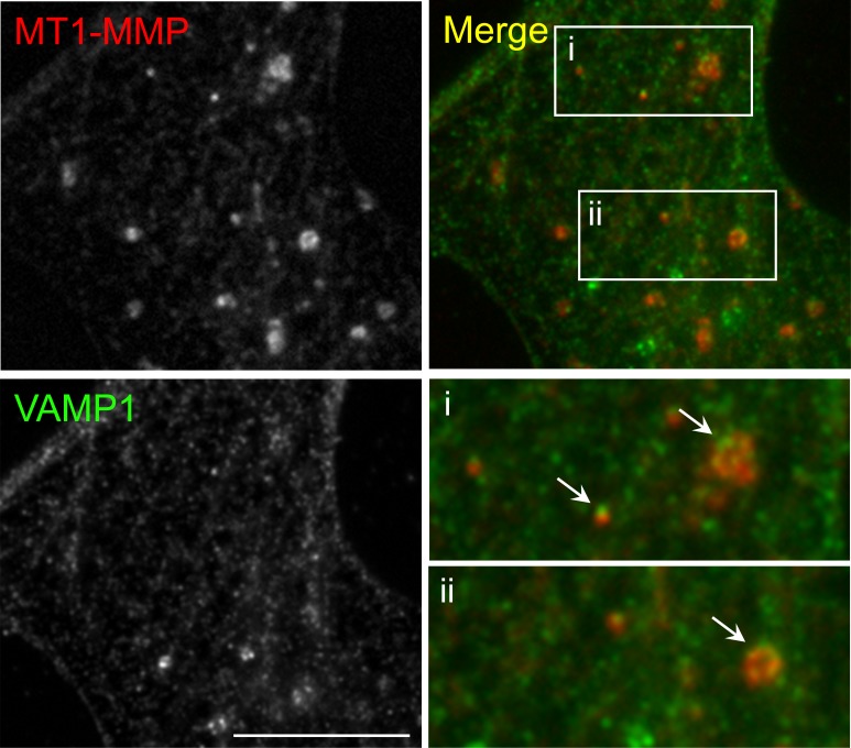 Figure 5—figure supplement 1. Immunostaining demonstrates the vesicular localization of endogenous MT1-MMP in cultured Xenopus muscle cells.Representative images showing the localization of some endogenous MT1-MMP signals at the vesicular compartment (arrows), as visualized by vesicle-associated membrane protein 1 (VAMP1). For clarity, two regions were shown in the 2X magnified view. Scale bar represents 10 μm. |
