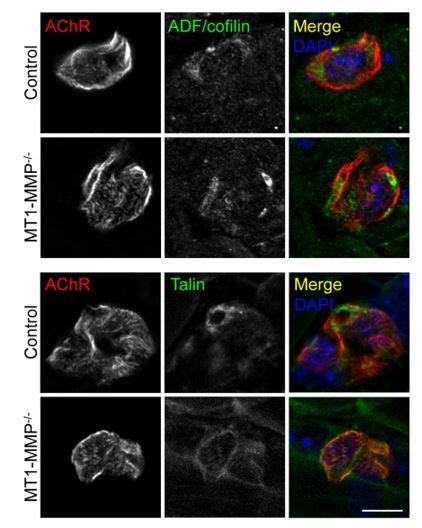 Author response image 4. Localization of PLS core and cortex markers at AChR clusters in postnatal mice.Representative confocal images showing the enrichment of PLS core marker, ADF/cofilin (top panels), and cortex marker, talin (bottom panels), at synaptic AChR clusters in longitudinal cryosections of hindlimb muscles isolated from P11 wild-type or MT1-MMP-/- mice. Maximum projection intensity images of 12 z-stack confocal frames with 0.48 µm intervals were constructed using ZEN 2.3 (Carl Zeiss). Scale bar represents 10 μm. |