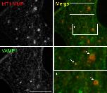 Figure 5. Intracellular trafficking of MT1-MMP is directed to PLS-associated AChR clusters.(A) Representative images showing the intracellular trafficking of MT1-MMP vesicles in a cultured muscle cell expressing both MT1-MMP-mCherry (MT1-mCherry) and EB1-GFP. The time-lapse series of two regions (i and ii) outlined in the merge image showed (i) the search-and-capture of MT1-mCherry vesicles (arrows) by an EB1-GFP comet (arrowheads); and (ii) the bidirectional movement of MT1-mCherry vesicles (arrows) along the microtubules (arrowheads). (B) Kymographs showing the spatiotemporal correlation between MT1-mCherry and EB1-GFP signals along K1 and K2 lines indicated in the merge image. The maximal projection of MT1-mCherry and EB1-GFP signals was constructed from 40 frames in a 40 s time-lapse series. Arrows indicate the examples of lateral displacement of initially stationary MT1-mCherry vesicles after EB1-GFP comets had passed through. (C) Representative TIRF-FRAP images showing the local capturing of MT1-mCherry vesicles at AChR clusters. After photobleaching, the recovery of MT1-mCherry signals and their trajectories in two regions of interest indicate (i) MT1-mCherry vesicles (arrows) were transported to and captured at the perforation of AChR clusters; and (ii) two groups of MT1-mCherry vesicles (red and green arrows) were transported to and captured at the same site of AChR cluster periphery over a period of 120 s. (D) Kymographs showing the spatiotemporal capture of MT1-mCherry vesicles at AChR clusters. Two kymographs were constructed from 120 time-lapse images along K3 and K4 lines, as indicated in the merge image (top panels in C). Arrowheads and arrows indicate the sites of MT1-mCherry capture at the perforated and peripheral regions of AChR clusters, respectively. Scale bars represent 10 μm, unless stated otherwise.Figure 5âfigure supplement 1. Immunostaining demonstrates the vesicular localization of endogenous MT1-MMP in cultured Xenopus muscle cells.Representative images showing the localization of some endogenous MT1-MMP signals at the vesicular compartment (arrows), as visualized by vesicle-associated membrane protein 1 (VAMP1). For clarity, two regions were shown in the 2X magnified view. Scale bar represents 10 μm. |