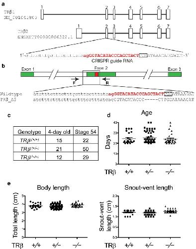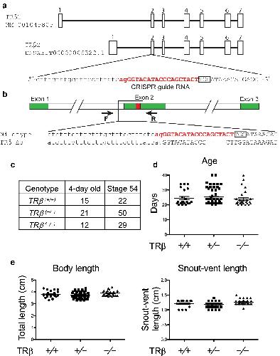 Fig. 1. Knocking out TRβ gene in Xenopus tropicalis does not affect early development. a Genomic structure of X. tropicalis TRβ gene and the CRISPR-short guide RNA (sgRNA) targeting TRβ. There are two known transcripts for X. tropicalis TRβ, each with 7 exons (boxes). The TRβ specific sgRNA was designed to target exon 2 present in both transcripts. The sgRNA sequences are shown in red. b Schematic diagram depicting the sequence of the sgRNA targeted region in the wild type and a TRβ mutant (5 base out-of-frame deletion) animal. Arrows represent primers used for genotyping: the forward primer F and the reverse primer R, respectively. c Mendelian distribution of 4-day old (around stage 45/46) or stage 54 tadpoles obtained from mating two TRβ(+/â) animals. Genotyping PCR was carried out by using tail tip genomic DNA of randomly selected 4-day old (stage 45/46) and stage 54 tadpoles, the onset of metamorphosis, and the results were close to the expected Mendelian distribution for the three expected genotypes. d Knocking out TRβ does not affect the developmental rate up to the onset of metamorphosis (stage 54). The time in days for each animal obtained from mating two TRβ(+/â) frogs to reach stage 54 was recorded and presented with the mean, marked as a line, and standard error (SE). No significant difference was observed for the 3 genotypes. e Knocking out TRβ does not affect the animal size and morphology at stage 54. The total body length and snout-vent length were measured on randomly selected animals at stage 54 and presented with the mean, marked as a line, and standard error (SE). No significant difference was observed for the 3 genotypes |