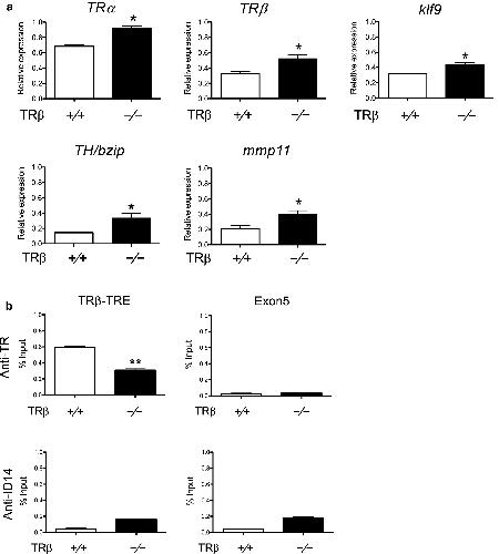 Figure 5. TRβ knockout reduces TR binding to the TRE region in the tadpole intestine after T3 treatment. Five or more age-matched wild type and TRβ knockout tadpoles at stage 54 were kept in 4-l plastic container and treated with or without 10 nM T3 for 18 h. The chromatin of the intestine was isolated and immunoprecipitated with antibodies against TR and ID14 as a negative control. The immunoprecipitated DNA was analyzed by real-time PCR for the presence of the TRE region or the exon 5, which lacks any TRE, of the TRβ gene. Note that TR binding to the TRE region was significantly reduced in the intestine of TRβ knockout tadpoles. Two asterisks (**) indicate statistically significant differences (Pâ<â0.01) |
