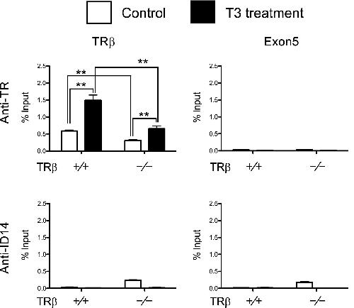 Fig. 5. TRβ knockout reduces TR binding to the TRE region in the tadpole intestine after T3 treatment. Five or more age-matched wild type and TRβ knockout tadpoles at stage 54 were kept in 4-l plastic container and treated with or without 10 nM T3 for 18 h. The chromatin of the intestine was isolated and immunoprecipitated with antibodies against TR and ID14 as a negative control. The immunoprecipitated DNA was analyzed by real-time PCR for the presence of the TRE region or the exon 5, which lacks any TRE, of the TRβ gene. Note that TR binding to the TRE region was significantly reduced in the intestine of TRβ knockout tadpoles. Two asterisks (**) indicate statistically significant differences (Pâ<â0.01) |