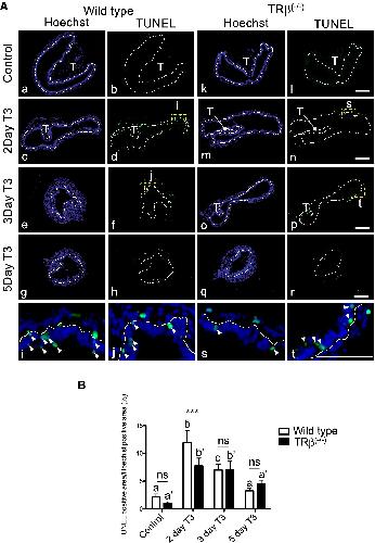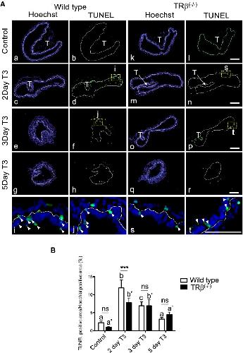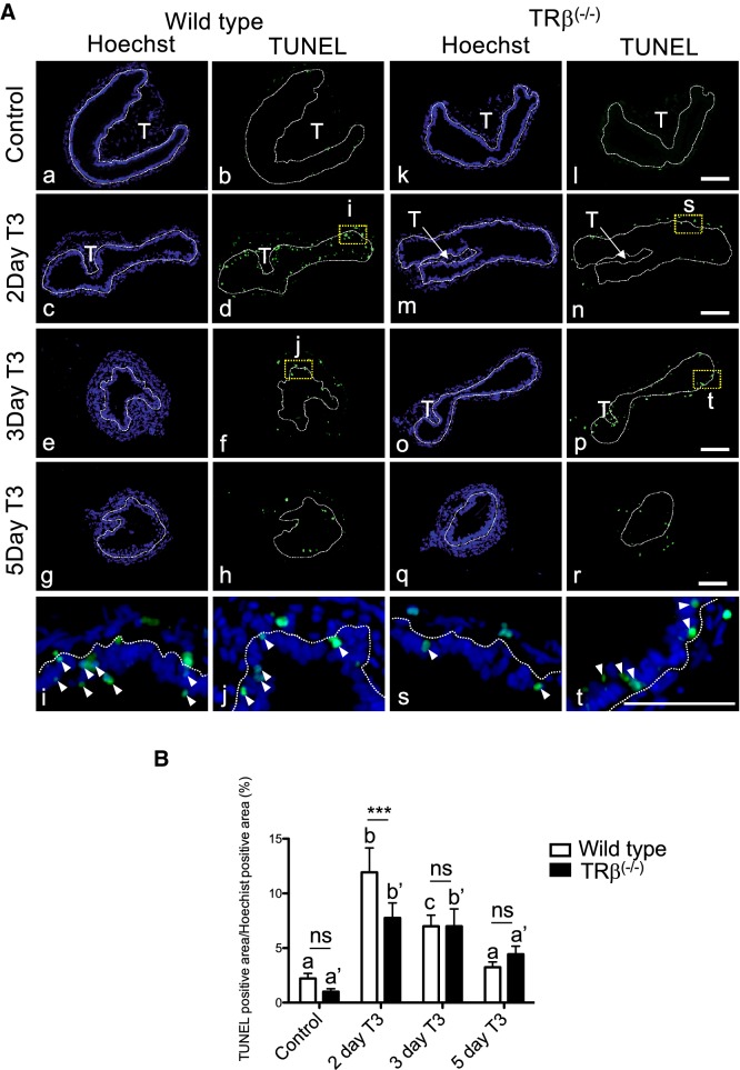 Fig. 7. Knocking out of TRβ tadpoles reduces epithelial cell death after T3 treatment. A Reduced TUNEL labeling for apoptotic cells in TRβ knockout tadpoles. Cross-sections of the intestine isolated from wild type (aâj) and TRβ knockout (kât) tadpoles at stage 54 treated with or without 5 nM T3 treatment for up to 5 days were subjected to TUNEL labeling for apoptotic cells and Hoechst 33342 staining for DNA. The dotted lines depict the epithelium-mesenchyme boundary, drawn based on morphological differences between epithelial cells and mesenchyme cells in the pictures of the stained tissues, under enhanced contrast and/or brightness by using Photoshop, if needed. Dashed yellow boxes (d, f, n and p) indicate the higher magnification (i, j, s and t), respectively. TUNEL: green, and Hoechst: blue. T: typhlosole. At least 3 tadpoles were analyzed for each genotype. Bars: 100 µm. B Reduced or delayed cell death in TRβ knockout tadpoles. The TUNEL positive area in A was quantified and normalized against the Hoechst 33342 positive area. Different lower case letters denote statistically significant differences (Pâ<â0.05) when compared in a single genotypes and asterisks (***) indicate a significant difference between the two genotypes (Pâ<â0.001). ns no significant difference |