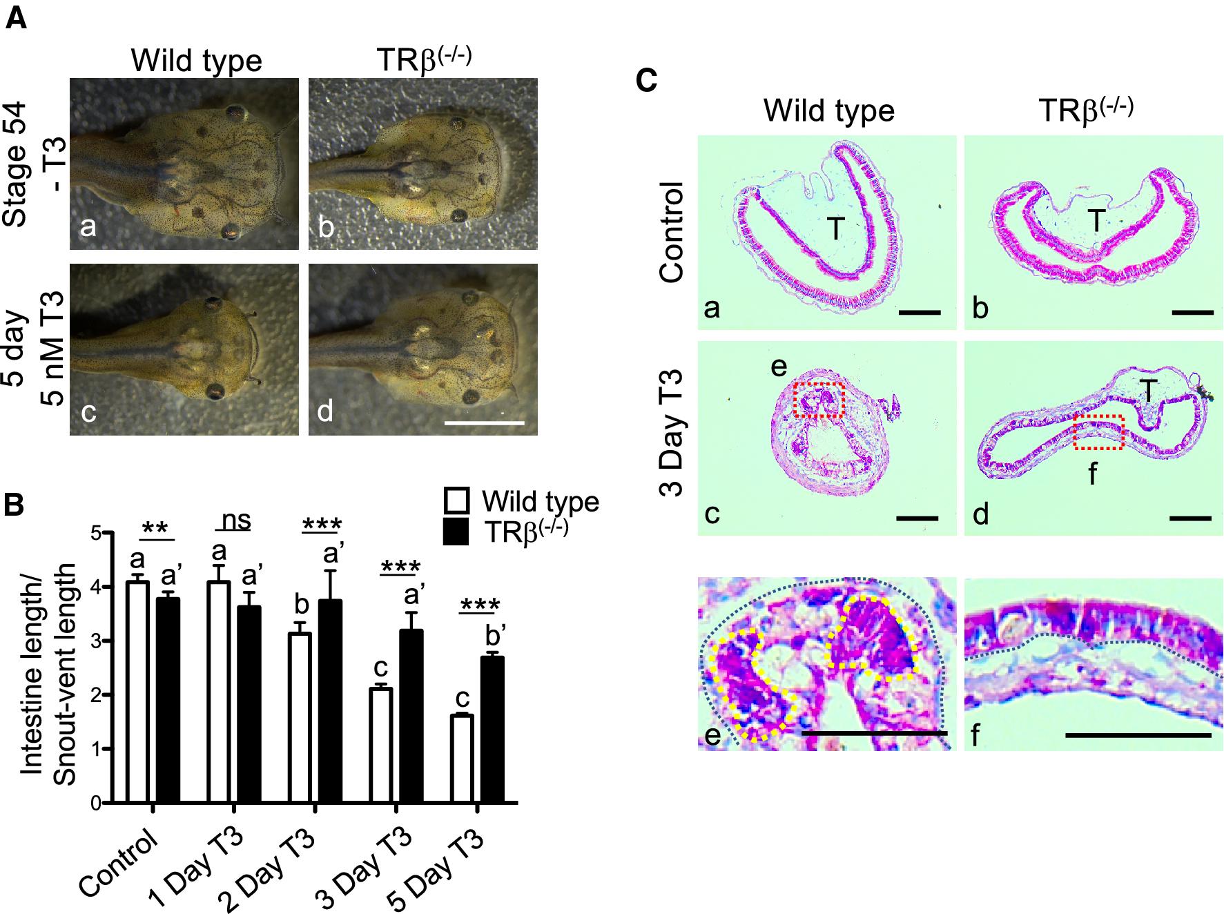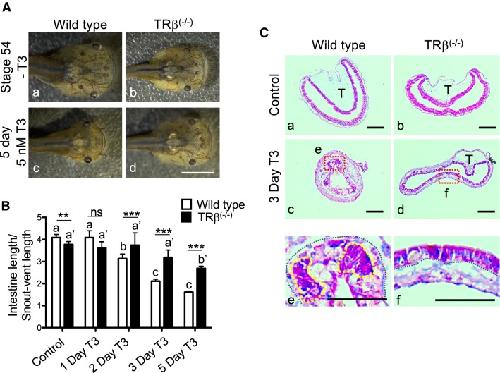 Fig. 3. Homozygous TRβ mutant tadpoles have drastically reduced responses to exogenous T3. A Representative photos of tadpoles treated with 5 nM T3 for 5 days. Age-matched stage 54 tadpoles were randomly selected and kept in a 4L plastic container with (c and d) or without (a and b) 5 nM T3 treatment for 5 days. They were then genotyped and photographed dorsally. Note that after T3 treatment, the wild type tadpole (c) showed obviously metamorphic changes and was morphologically distinct from TRβ(â/â) tadpoles (d), which was similar to the untreated tadpoles. Bars: 1 mm. BTRβ knockout tadpoles had reduced intestinal shortening in response to T3. The lengths of the intestine of the tadpoles as treated in A were measured and normalized against the snout-vent length. Note that after T3 treatment, the intestine was significantly shortened in wild type tadpoles but this change was reduced and delayed in the TRβ(â/â) tadpoles. Different lower-case letters denote statistically significant differences (Pâ<â0.05) when compared in each genotypes and asterisks (** or ***) indicate a significant difference when compared to the wild type group at the indicated days for T3 treatment (Pâ<â0.01 or Pâ<â0.001). ns: no significant difference. C T3 treatment failed to induce epithelial remodeling in the TRβ knockout tadpoles. Age-matched tadpoles at stage 54 were treated with 5 nM T3 for 3 days. Cross-sections of the intestine isolated from wild type (a, c and e) and TRβ knockout (b, d and f) tadpoles were stained with MGPY (methyl green-pyronin Y). Dashed red boxes (c and d) indicate the higher magnification (e and f), respectively. The black-dotted lines depict the epithelium-mesenchyme boundary, drawn based on morphological differences between epithelial cells and mesenchyme cells in the pictures of the stained tissues. The yellow-dotted lines indicate the cluster of proliferating epithelial cell which are well stained in wild type tadpoles after 3 days T3 treatment (e). T typhlosole. Bars: 100 µm |